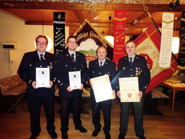 Mit Herbert (r.) und Robert Grünberger (2. v.r.) sind zwei Alphatiere der Feuerwehr Leoprechting nicht mehr zur Wahl angetreten. Lediglich Albert Grünberger macht als langjähriger Kassier noch weiter, um seinen Nachfolger einzuarbeiten. Den Grünbergers scheint die Feuerwehrarbeit in die Wiege gelegt zu sein. Bereits Vater Alfons Grünberger war viele Jahre Kommandant der Wehr und Kreisbrandmeister. Wohl einmalig in Bayern…